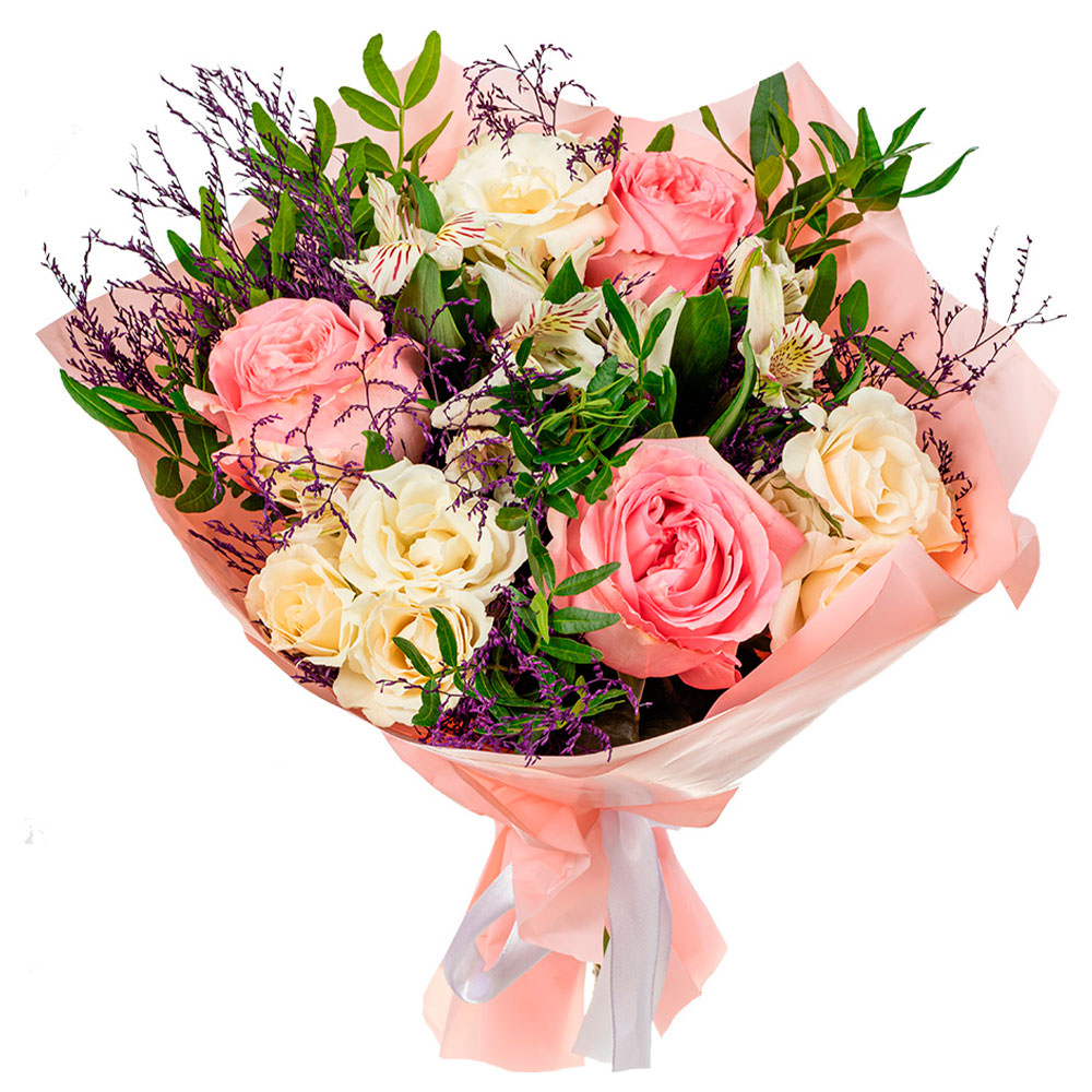 Роза одноголовая, роза кустовая, альстромерия, лимониум, зелень.
