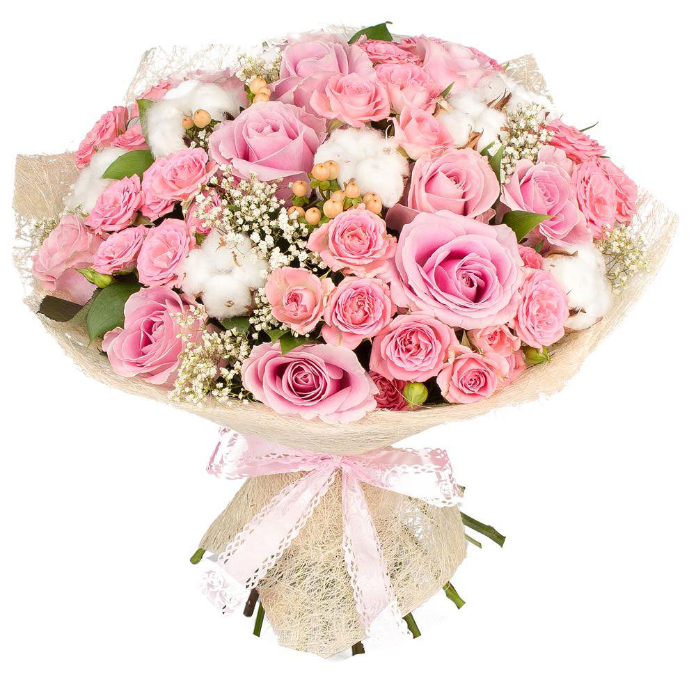 Роза одноголовая, роза кустовая, гипсофила, гиперикум, хлопок.