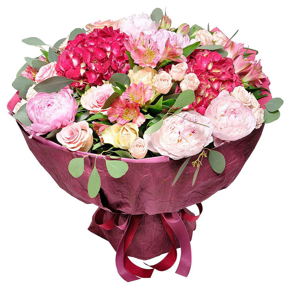 Пион, гортензия, роза кустовая, роза одноголовая, альстромерия, эвкалипт.