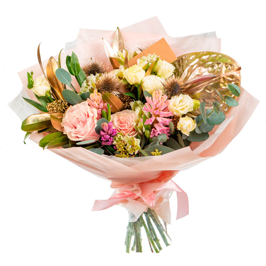 Антуриум, роза, гиацинт, альстромерия, эвкалипт, эустома, эрингиум, скимия.