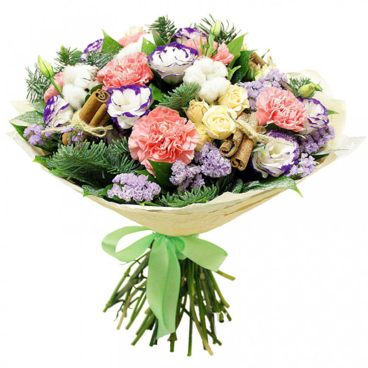 Эустома, гвоздика, роза кустовая, хлопок, статица, декоративные элементы, зелень.