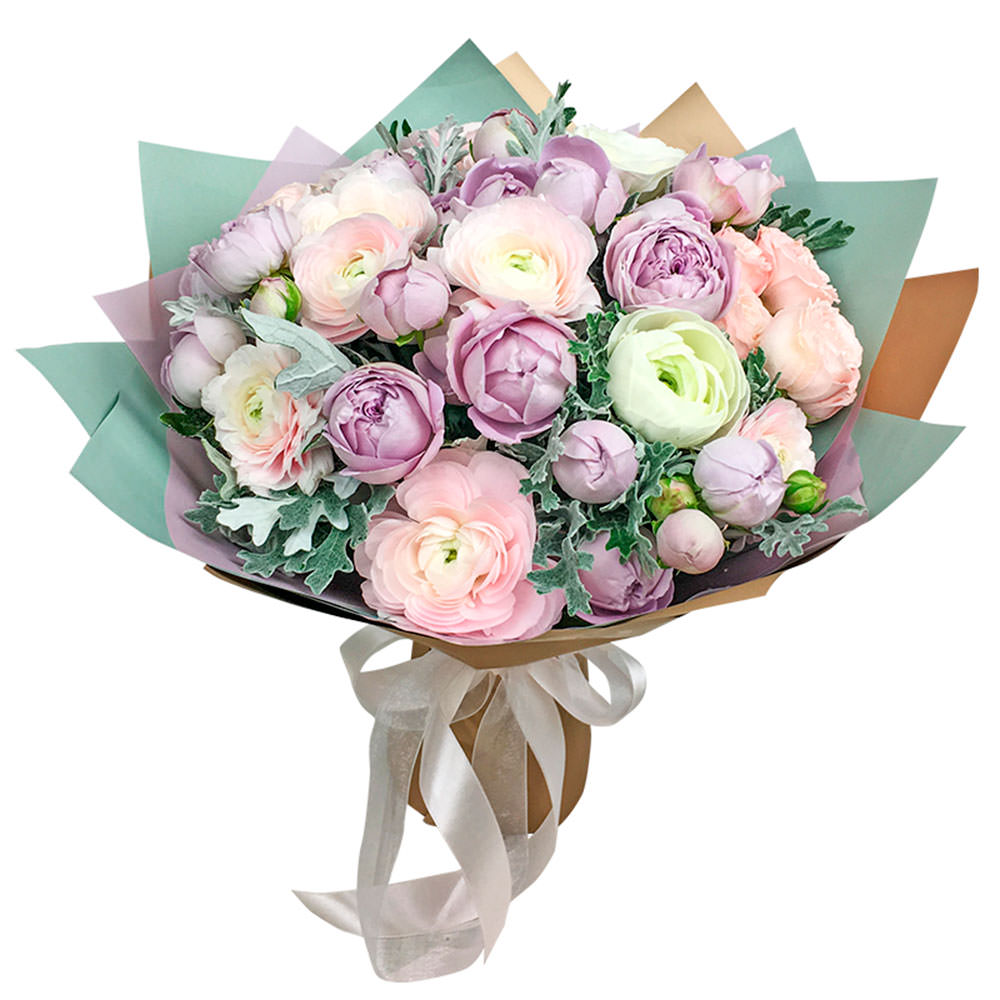 Роза пионовидная кустова, ранункулюс, зелень.