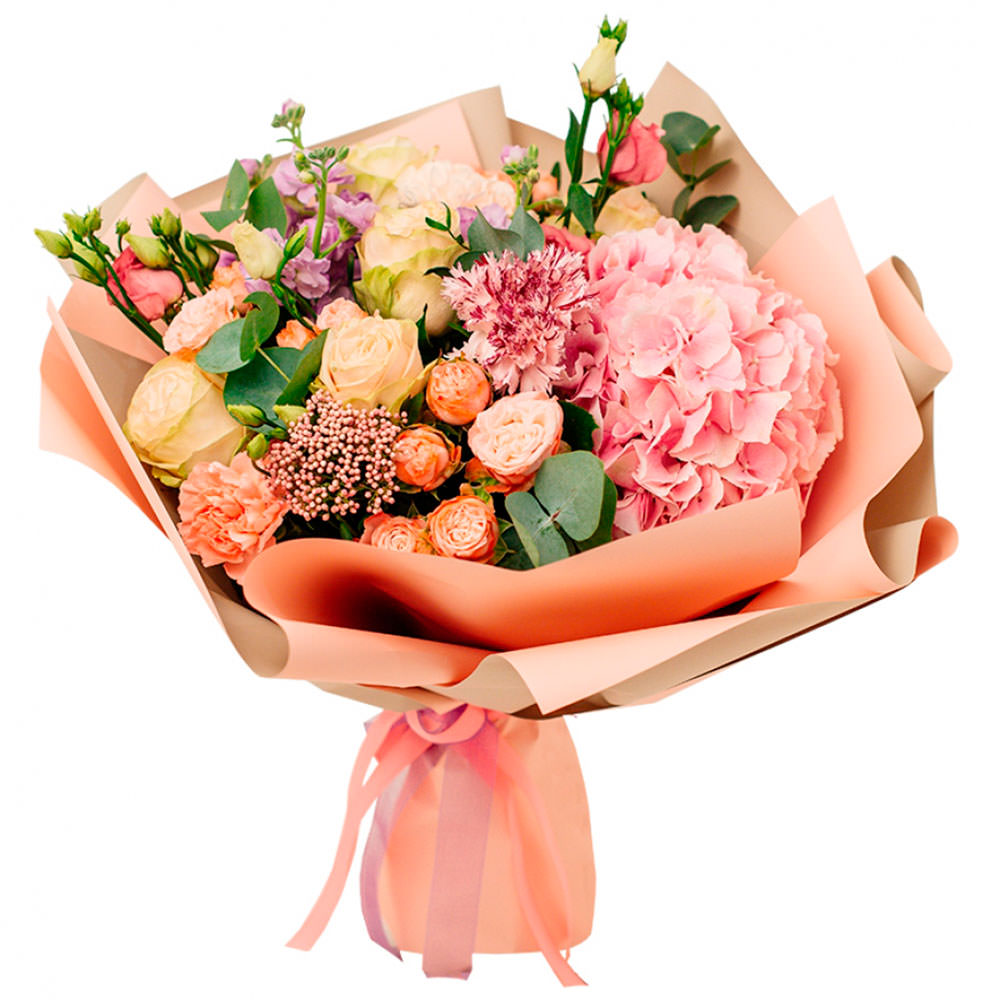 Гортензия, роза кустовая, эустома, роза одноголовая, эвкалипт, маттиола.