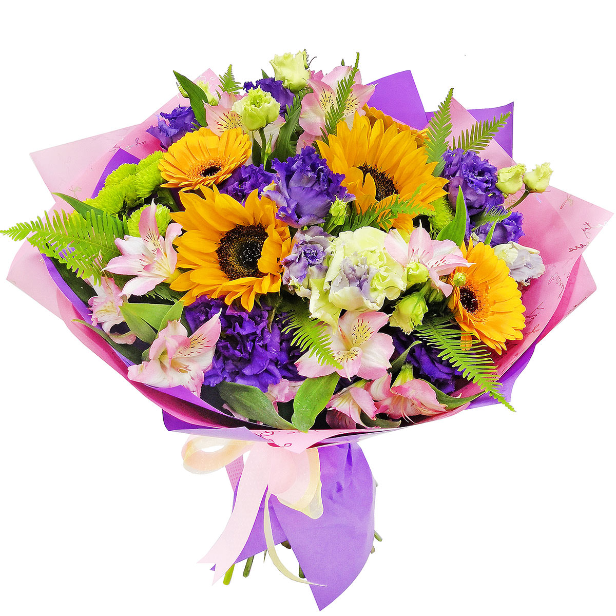 Подсолнух, эустома, альстромерия, хризантема кустовая, аспарагус.
