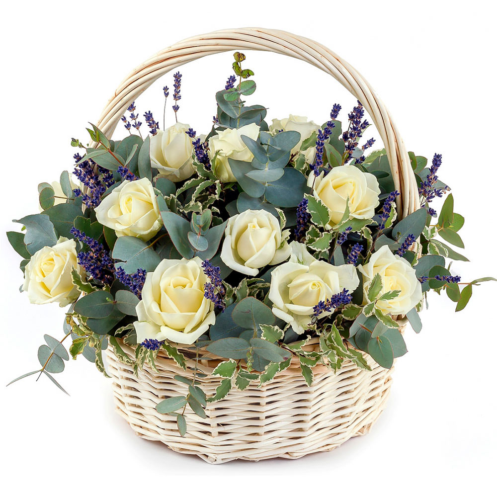 Роза белая, эвкалипт, лаванда.